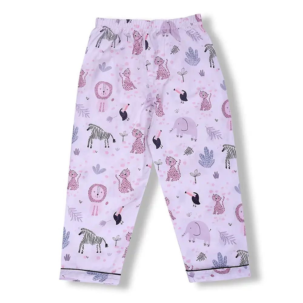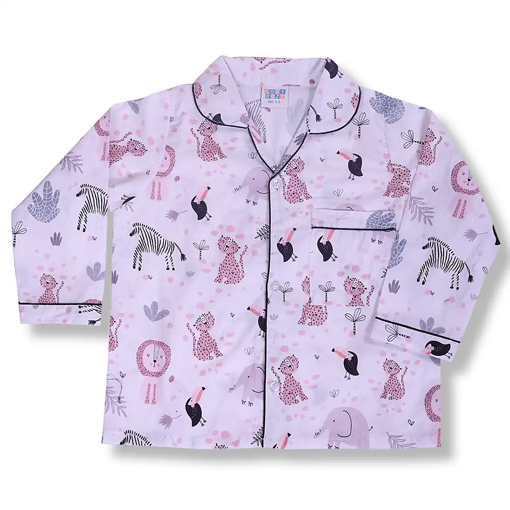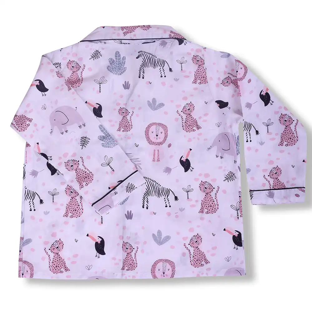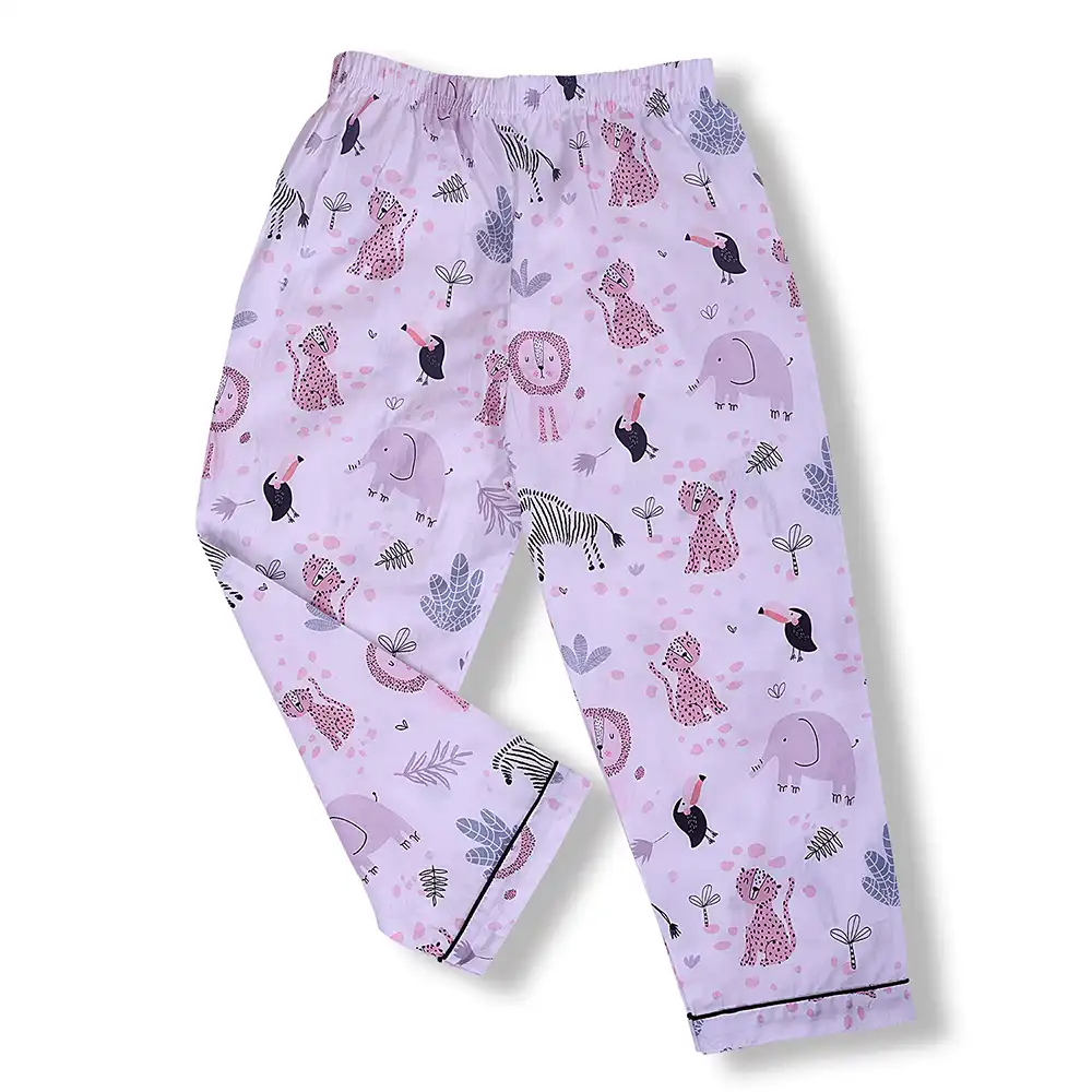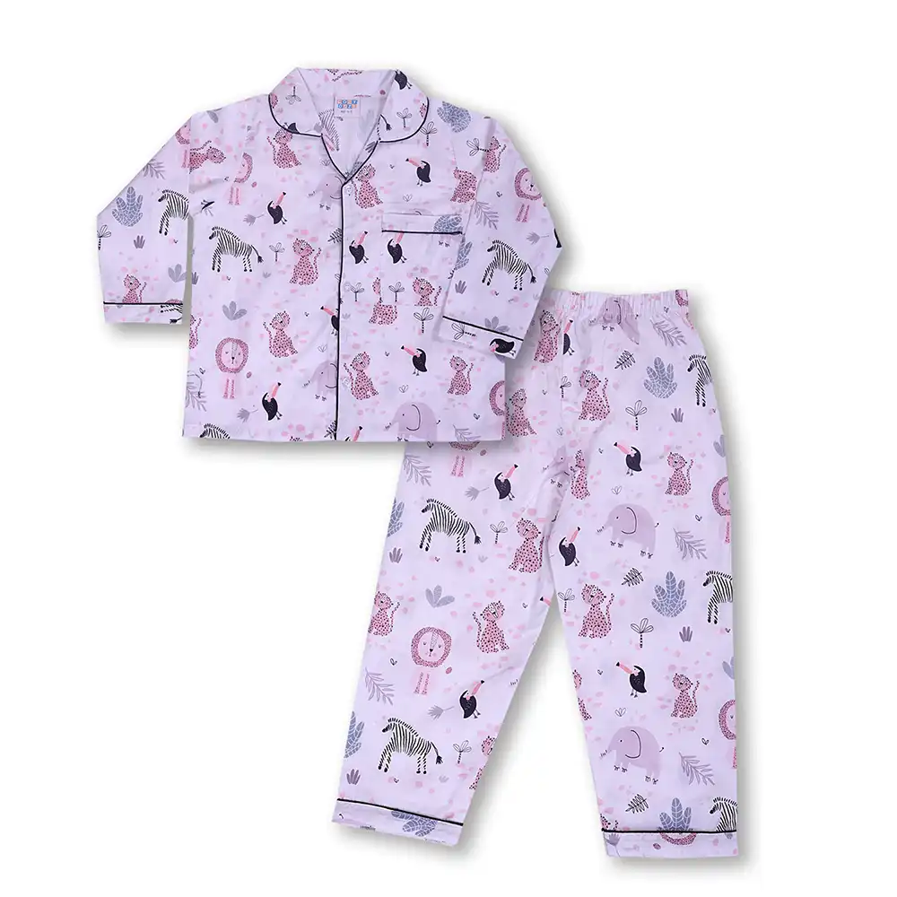 Soft and breathable cotton night suit featuring adorable safari animal prints on a soothing lavender base. Designed with a full-sleeve button-down top and comfortable elastic waist pajama for cosy, all-night comfort.